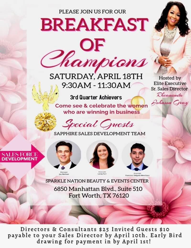 Get ready for a true Breakfast of Champions—an energizing, empowering experience designed to fuel your goals and elevate your mindset! This is more than just breakfast; it’s a powerful moment to connect, grow, and be inspired alongside excellence. The incredible Sapphire Development Team from Mary Kay will be in attendance, bringing wisdom, success strategies, and the kind of motivation that can truly shift your trajectory. If you’re serious about your growth, your business, and stepping into your next level, this is exactly where you need to be. You don’t want to miss being in the room where vision meets opportunity!